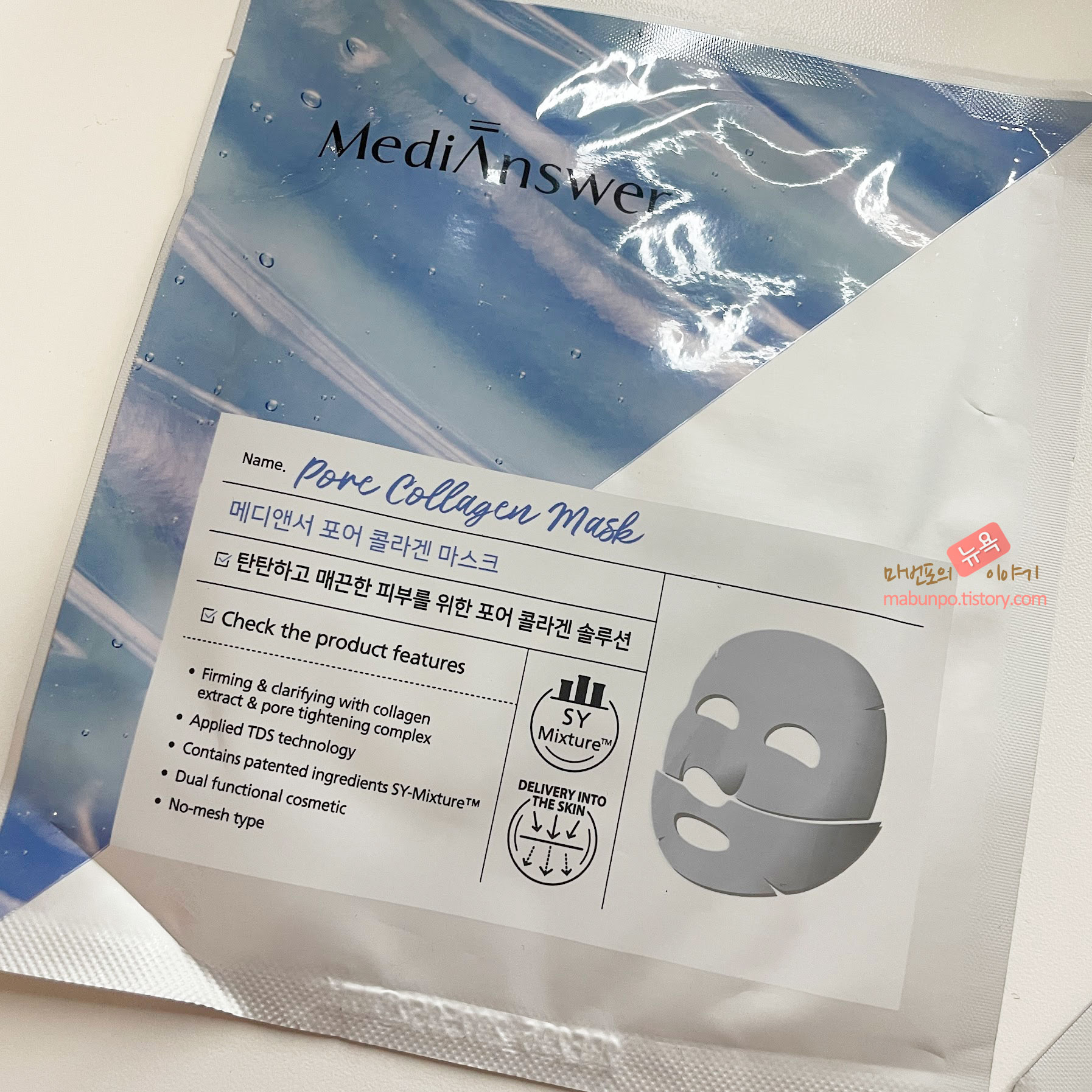 포어 콜라겐 마스크팩은 연한 하늘색을 띄고 있고